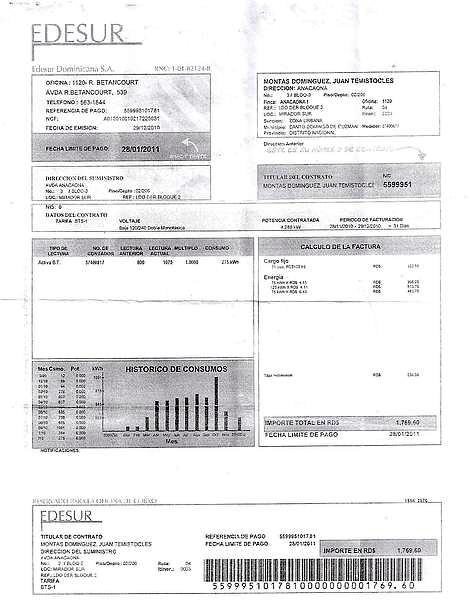 Factura de electricidad del ministro Temístocles Montás, correspondiente a enero de 2011.